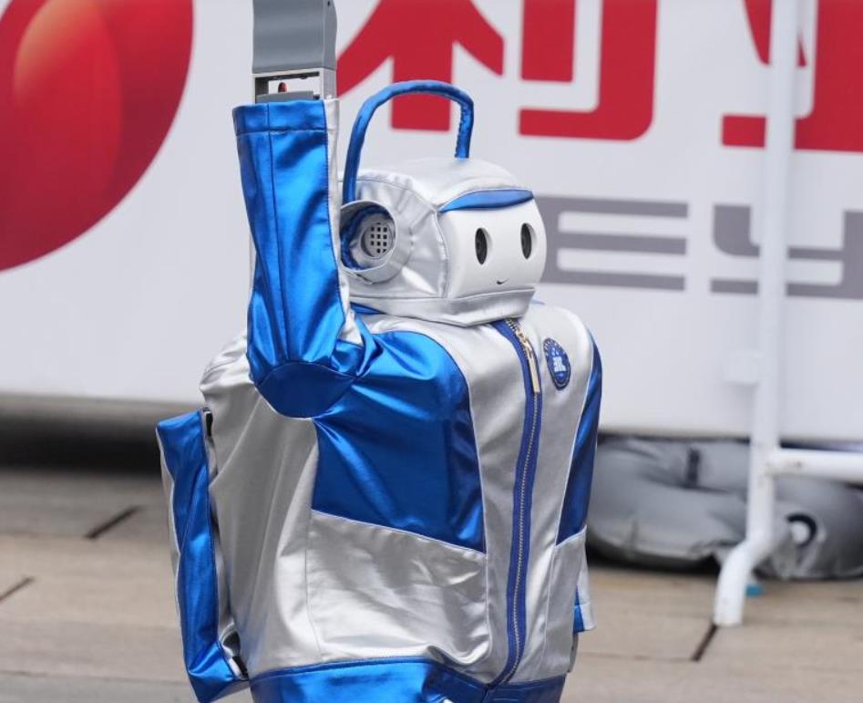 4月19日,小巨人队选手北职大“0306”小巨人在比赛中挥手。新华社记者 张晨霖 摄