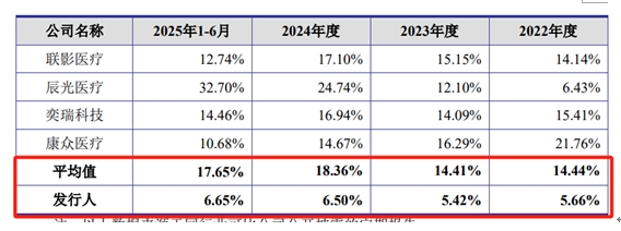 根据招股书及公开数据,2022年至2025年上半年,健信超导的主营业务毛利率分别为19.56%、22.84%、24.94%和24.84%,而同期同行可比公司的毛利率均值分别为46.27%、45.59%、45.17%和47.41%。这意味着,健信超导的毛利率长期不足同行的一半,差距至少达20个百分点。例如,联影医疗作为行业龙头,其毛利率长期维持在45%以上,而健信超导的毛利率甚至低于部分传统制造业企业。
