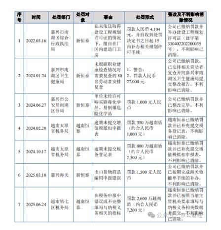 新恒泰在经营过程中还存在诸多违法违规行为,其经营行为的合法性和独立性受到严重质疑。报告期内,公司及子公司因工程建设、职业健康、危化品采买、税务等方面违法违规行为,多次受到罚款等行政处罚。其中,2024年1月24日,公司未根据职业健康检查情况对需要复查的80名劳动者安排复查,被嘉兴市南湖区卫生健康局予以警告及罚款人民币27000元。这些行政处罚不仅反映了公司在经营管理上的漏洞和不足,也给公司的声誉带来了负面影响。