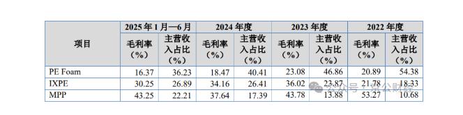 新恒泰的业绩增长主要依靠技术创新及产品创新,但公司主要产品的单价和毛利率却呈现出承压态势。占主营业务高达八成以上的PE Foam、IXPE、MPP三大业务,在报告期内单价和毛利率均有所波动。2022-2025年上半年,新恒泰主营业务毛利率分别为21.66%、26.53%、24.25%和24.41%。其中,PE Foam产品毛利率分别为20.89%、23.08%、18.47%及16.37%,IXPE产品毛利率分别为21.78%、36.02%、34.16%及30.25%,MPP 产品毛利率分别为53.27%、43.78%、37.64%及43.25%,PVC 耐磨层产品毛利率分别为-4.07%、1.43%、5.35%及 4.37%。
