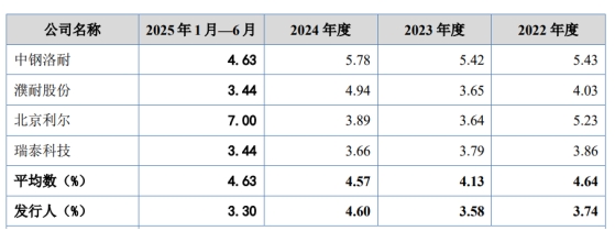 然而,与同行可比公司中钢洛耐、濮耐股份、北京利尔、瑞泰科技相比,瑞尔竞达的业绩表现显得格格不入。2024年,在行业整体承压的大背景下,上述同行可比公司的扣非后归母净利润均出现不同程度的同比下滑,而瑞尔竞达却逆势增长。耐火材料行业在2024年面临着产能持续过剩、产业集中度低、减排和智能制造水平低、创新能力不足等诸多问题,尽管行业集中度在向头部优势企业集中,但整体经营形势依然严峻。在这样的大环境下,瑞尔竞达核心利润的逆势增长,其增长逻辑与行业基本面的匹配性令人质疑。