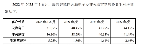 报告期各期,天海电子向海昌智能采购的主要设备及备件、模具及备件金额分别为:1.69亿元、1.57亿元、1.55亿元及1.04亿元,占向海昌智能采购金额的比例分别为85.33%、85.57%、86.25%及 81.59%。而海昌智能卖给天海电子的设备毛利率,与卖给其他非关联客户的毛利率,差异波动不定,时正时负。更微妙的是,在一些可比设备的采购价格对比中,天海电子从关联方采购的价格时而显著低于第三方,时而却又高于第三方。天海电子对此的解释多为“配置不同”、“定制化需求”。诚然,设备配置存在差异,但这种定价的波动与差异,是否给利润调节留下了过于灵活的操作空间?