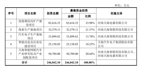 天海电子本次IPO预计募集资金金额约24.6亿元,募集资金投向“连接器技改扩产建设项目”“线束生产基地项目”“汽车电子生产基地项目”“智能改造及信息化建设项目”和“天海智能网联汽车产业研究院及产业园配套项目”。然而,这些募投项目的前景并不乐观,资金使用效率存在疑问。