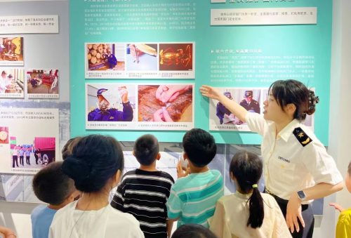 在活动的第二阶段,参与的小朋友们均佩戴“守护国门小卫士”徽章,在海关关员的带领下,参观了海关截获的各类动植物制品、杂草、昆虫等标本,并在海关实验室现场体验了各种仪器检测设备,利用快检设备快速检测蔬菜农药残留,在寓教于乐中了解国门卫士日常工作,传递国门生物安全知识。