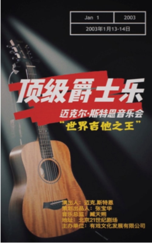 2003年1月,在北京21世纪剧场策划出品“世界吉他之王”迈克·斯特恩北京音乐会。