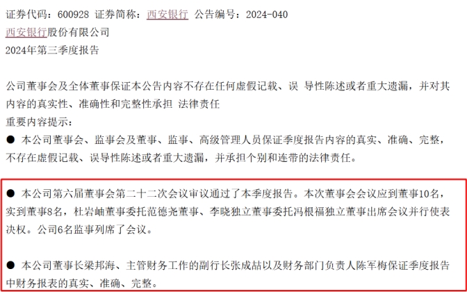 而在人事方面,西安银行也是状况频出。2023年9月,梁邦海开始暂代西安银行董事长一职,并于2024年7月15日正式获批董事长任职资格。然而,2023年10月,董秘石小云犯下了窗口期买卖公司股票的错误,在公司第三季度报告披露同日进行股票增持,严重违反了上市公司董监高在特定窗口期不得买卖本公司股票的相关规定。 波折并未就此停止,2024年6月,原副行长狄浩突然坠楼身亡,这一事件引发了社会的广泛关注和诸多猜测,给银行带来了不小的舆论影响。