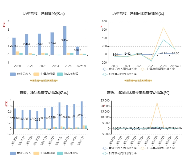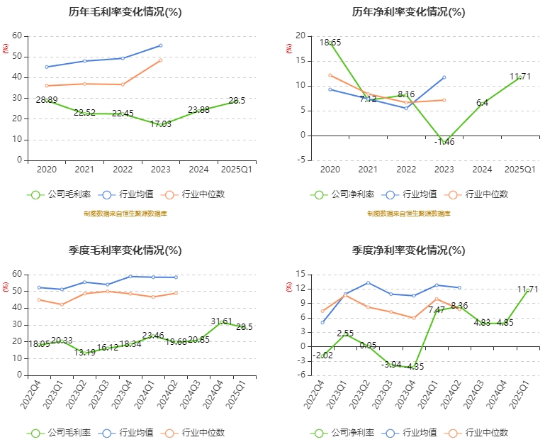 2025年一季度,公司毛利率为28.50%,同比上升5.04个百分点,环比下降3.11个百分点;净利率为11.71%,较上年同期上升4.24个百分点,较上一季度上升6.86个百分点。