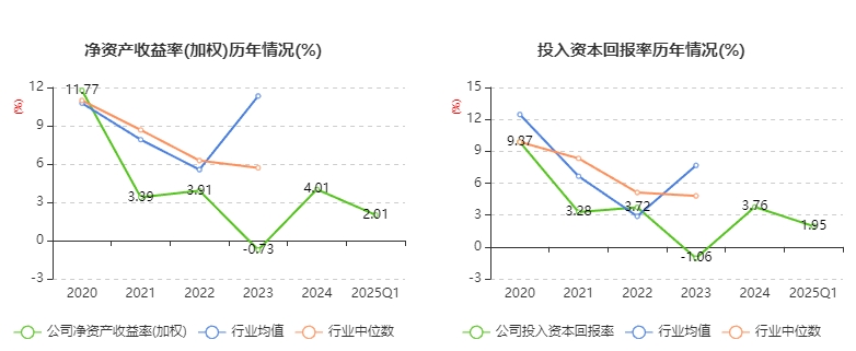 盈利能力方面, 2025年一季度公司加权平均净资产收益率为2.01%,同比上升0.92个百分点。公司2025年第一季度投入资本回报率为1.95%,较上年同期上升0.92个百分点。