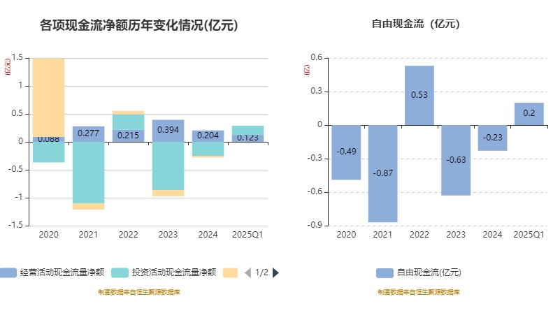 截至2025年一季度末,公司经营活动现金流净额为1231.67万元,同比下降2.58%;筹资活动现金流净额0元,同比增加2.5万元;投资活动现金流净额1639.42万元,上年同期为-642.9万元。