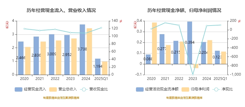 2025年一季度,公司营业收入现金比为122.14%,净现比为107.54%。