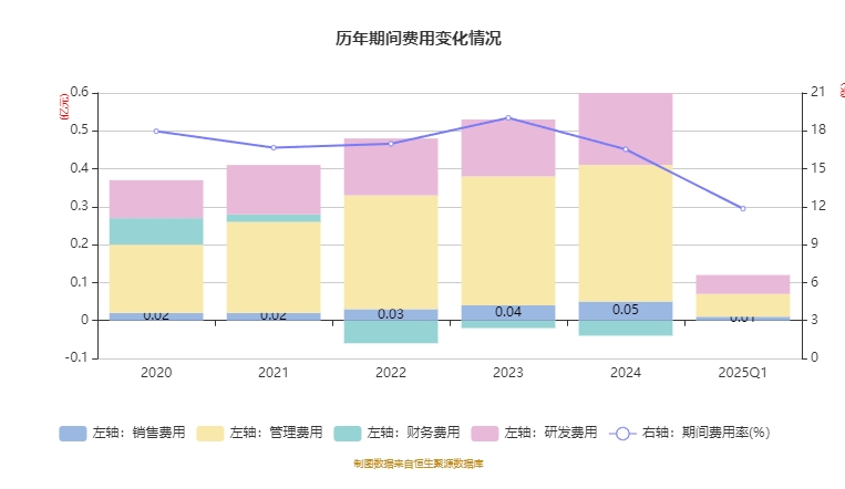 2025年第一季度,公司期间费用为1159.05万元,同比增长204.66万元;但期间费用率为11.85%,同比下降0.26个百分点。其中,销售费用同比增长116.43%,管理费用同比下降18.66%,研发费用同比增长59.49%,财务费用-35.03万元,去年同期-118.74万元。