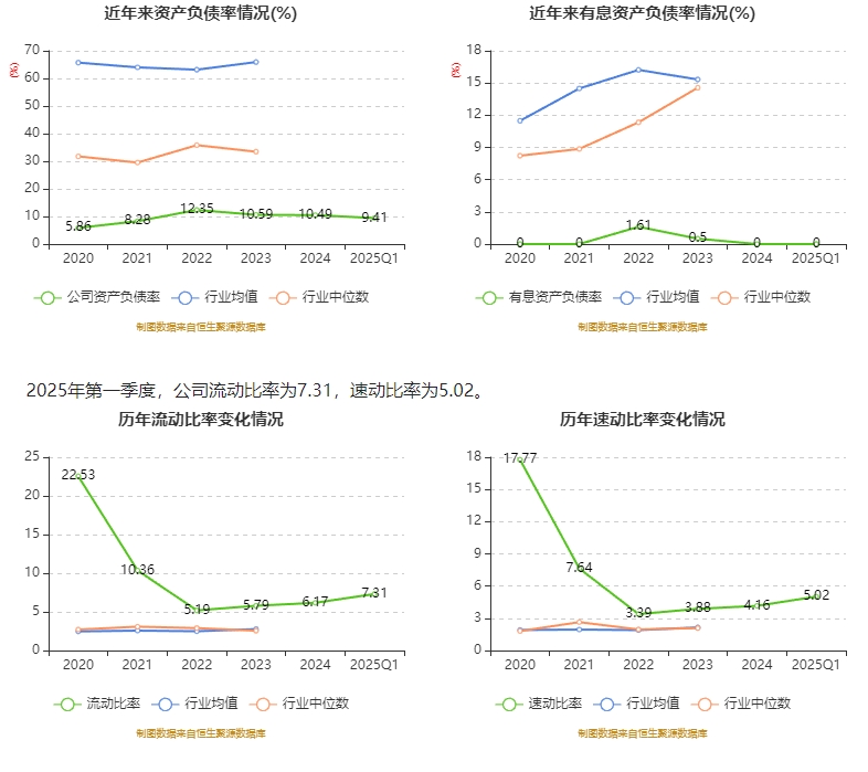 偿债能力方面,公司2025年一季度末资产负债率为9.41%,相比上年末减少1.08个百分点;有息资产负债率为0%,相比上年末基本持平。