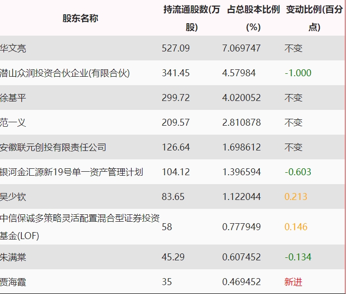一季报显示,2025年一季度末的公司十大流通股东中,新进股东为贾海霞,取代了上年末的杨芳。在具体持股比例上,吴少钦、中信保诚多策略灵活配置混合型证券投资基金(LOF)持股有所上升,潜山众润投资合伙企业(有限合伙)、银河金汇源新19号单一资产管理计划、朱满棠持股有所下降。