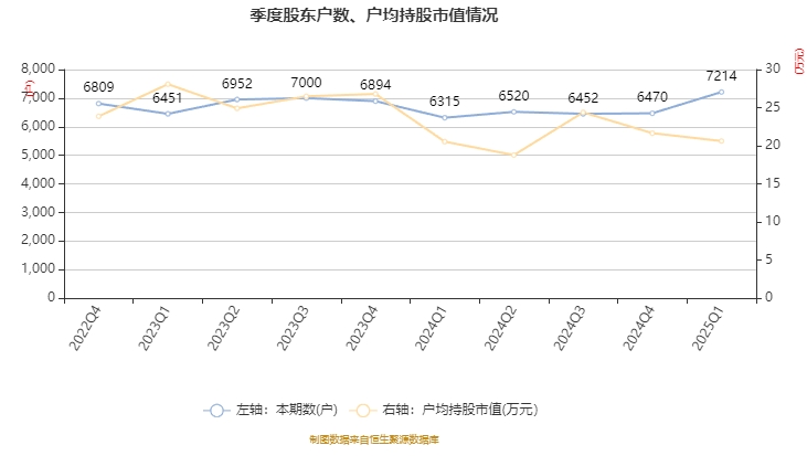 筹码集中度方面,截至2025年一季度末,公司股东总户数为7214户,较上年末增长了744户,增幅11.5%;户均持股市值由上年末的21.65万元下降至20.62万元,降幅为4.78%。