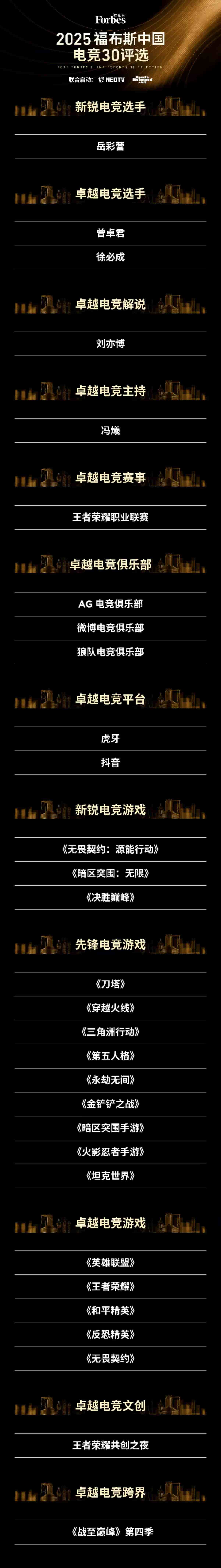 以下为“2025 福布斯中国电竞30评选”的最终结果: