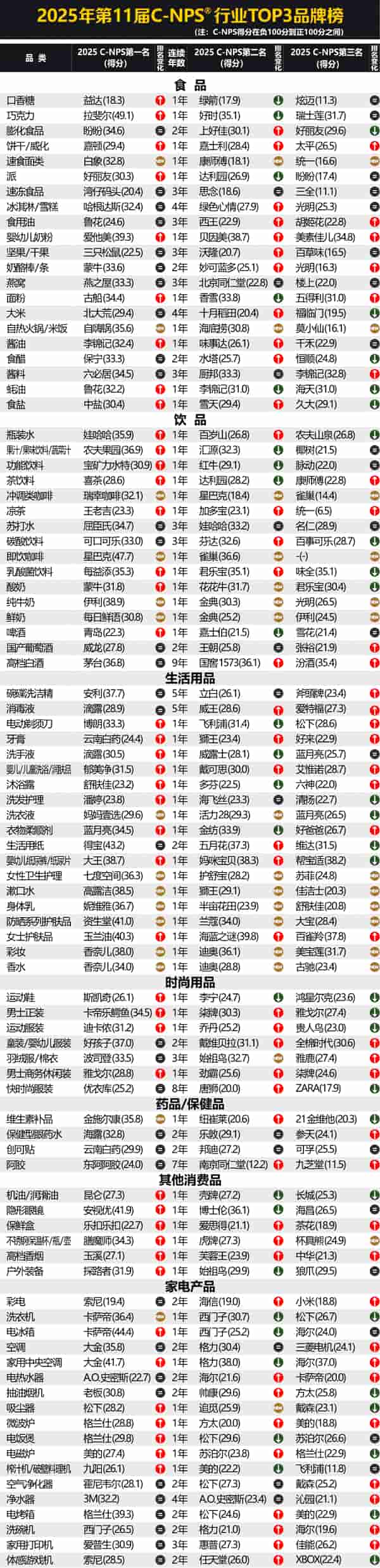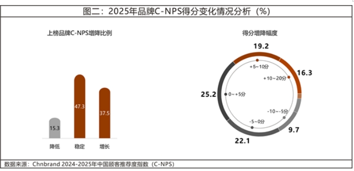当然,除了行业整体平均水平的提升之外,我们也欣喜于这种“向上的力量”已经成为多数品牌的努力成果。2025年C-NPS中仅有15.3%的品牌的C-NPS得分下降,有近4成的品牌C-NPS得分上升。在增长的品牌中,近半增长分数超过了10分。