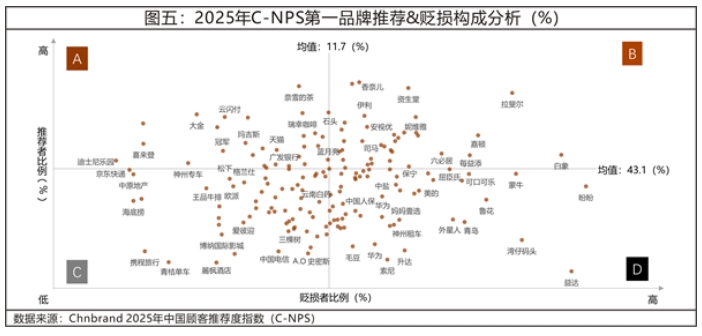 第四类,D区品牌,虽然同为领导品牌,但其推荐者比例并不高,贬损者比例在领导品牌中尤为突出,显然,直接改善短板必要且急迫。