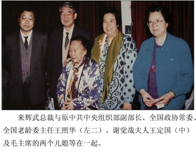 来辉武教授始终心怀敬老之情,多次探望老同志及其家属,如谢觉哉夫人王定国、陈云夫人于若木、邓拓夫人丁一岚、张云逸夫人韩碧等,关心他们的生活与健康,并以505神功元气袋等产品实际改善老年人的生活质量。