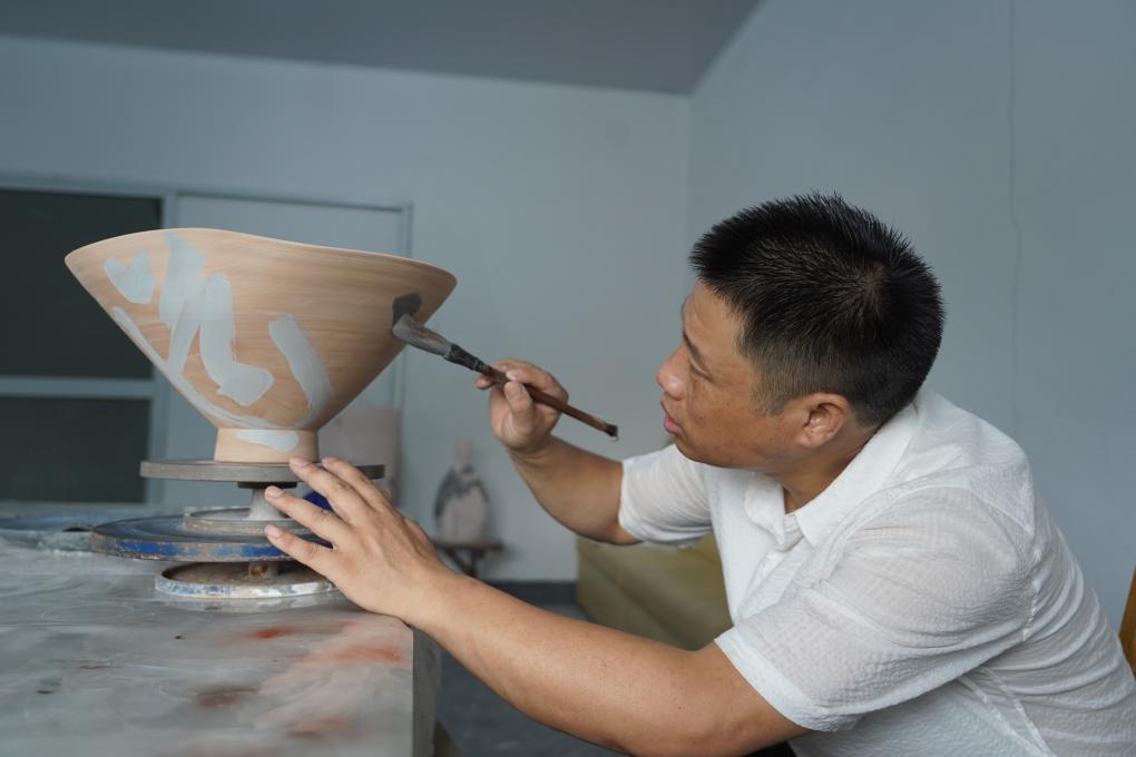 47岁的尹志军手握沾满颜料的笔,笔尖落在泥坯上,笔锋回转间,横竖撇捺等笔画与瓷泥融为一体。以泥坯为纸、以颜料为墨,与传统书法纸上落笔不同,陶瓷书法作品还得经过窑火的淬炼,才算真正完成。