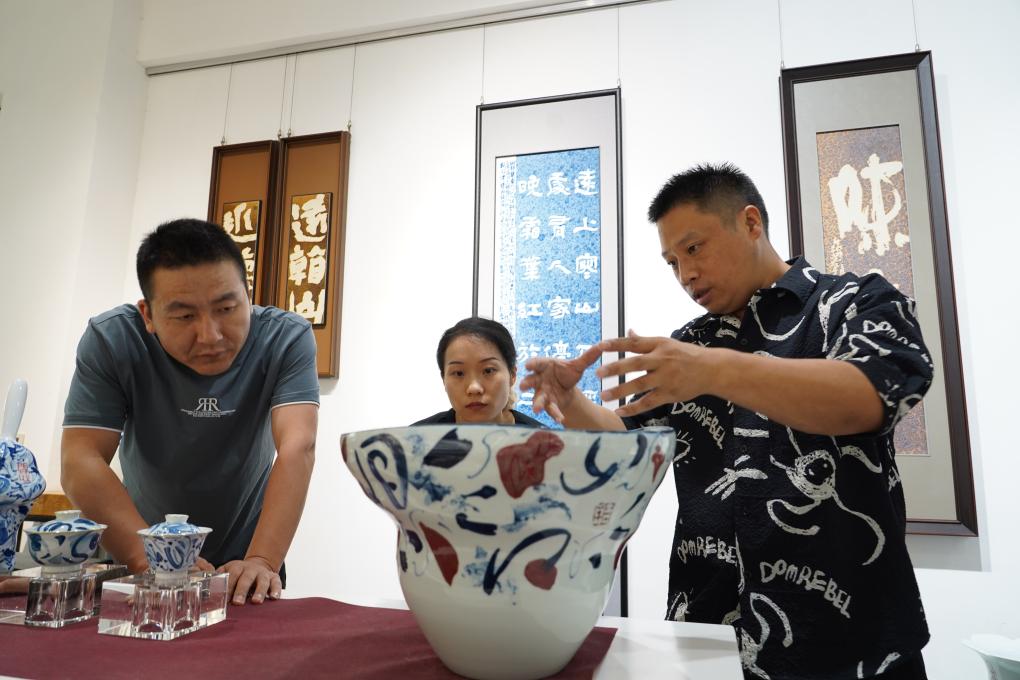 走进位于江西省景德镇市陶艺街20号的“字非字”陶瓷书法非遗工作室里,景德镇陶瓷书法非遗传承人尹志军正在向他的学生们讲解陶瓷书法技巧。工作室的作品展厅内,造型风格各异的作品陈列其中,自由灵动的笔画线条与青花釉里红形成对比,带来特殊的视觉效果,也让人不禁疑问:“是字还是画?”