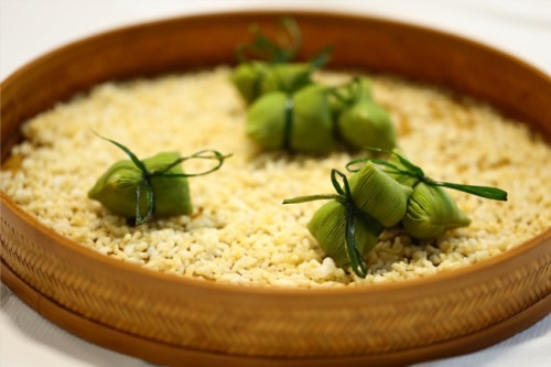 “碧装束裹三角尖,玉带一缕腰间缠。” 粽子,中华民族端午节传统小吃,这道点心以时新之味展现唐宋风骨,用酥皮代替粽子叶,口感更加美味。制好的酥皮,包入糯米加入冬笋、青豆等炒制的馅心,系上围腰,外酥里糯,咸鲜酥香。撒入炸好的米做点缀,形象逼真,获得了现场评委和嘉宾的一致好评,点赞无数。