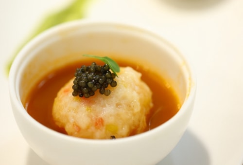“微雨过,小荷翻,榴花开欲然。”这道凉菜将中式食材用西式的烹饪方式呈现,新鲜蔬菜搭配Q弹的龙虾肉,入口即化的爽滑感和番茄的酸爽感带来初夏风味,罗勒的清香沁人心脾,撒上帕马森芝士,点缀鱼子酱、香菜苗,置于香脆金盏内装盘,色彩及口感风味皆具层次感,诠释端阳初夏万物鲜华的惬意情景。