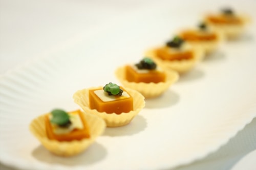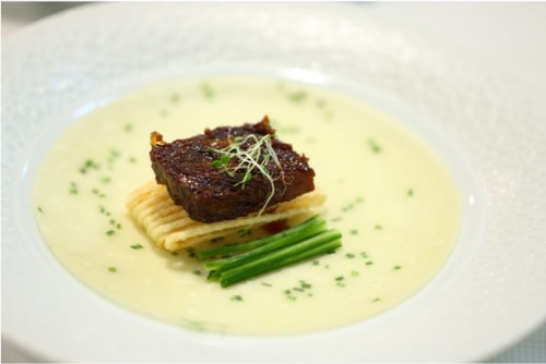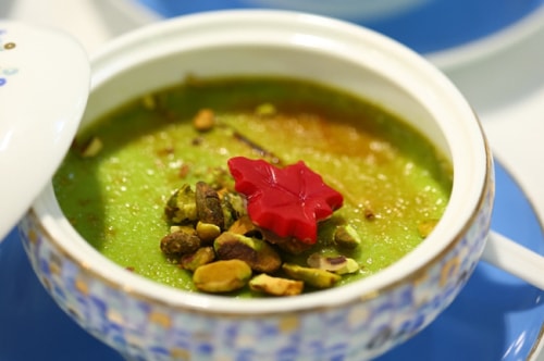 “入骨甜香浓似酒” 清朝诗人郭麟的诗句与这道夺金美食产生了跨时代的共鸣。这道甜品采用中式装盘,中西合璧。使用茉莉花茶与牛奶烤制布丁,甜蜜的焦糖和浓郁的开心果融合,特别点缀加拿大枫叶巧克力,消热清暑,口感嫩滑,体现口味层次感。