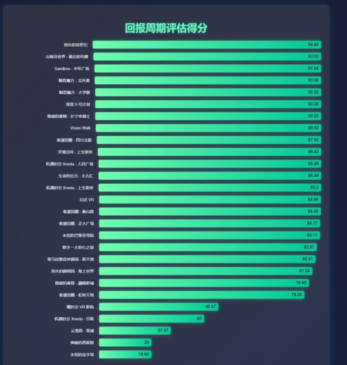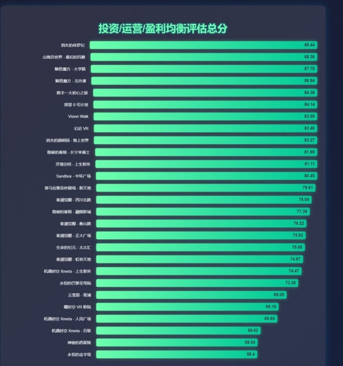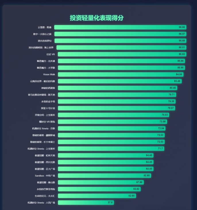 综合评分是各部分评分的平均值,综合了投资轻量化、运营轻量化、盈利能力和回报周期的得分,粗略地展现了各项目在多个维度的整体表现。另外,需要注意的是,由于本次评估体系中对轻量化的投资、轻量化运营、回收周期等的评估项较多,因此轻量化的项目将在总的均衡性打分上显得更加优秀,而较大的大空间VR项目则有可能在打分上更吃亏一些,这是阅读者需要注意的。