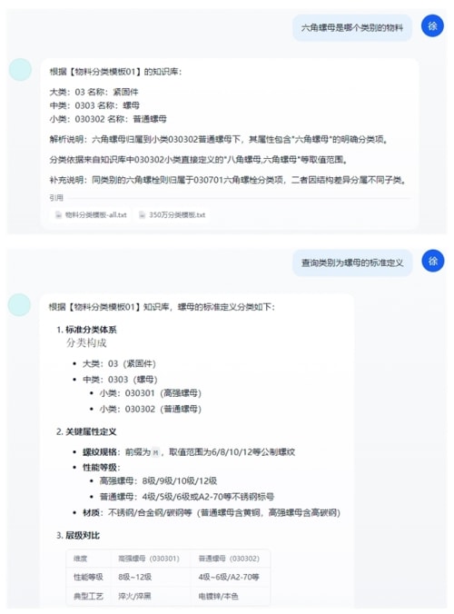 全面信息整合:知识库集中管理海量物料标准信息,涵盖规格、材质、供应商、应用场景等多维度数据,确保用户一次性获取完整信息。