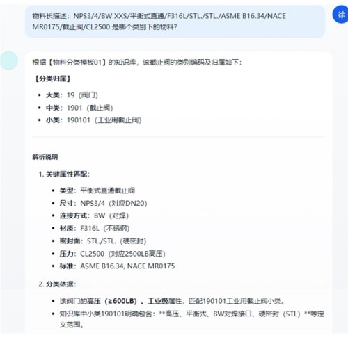 智能问答交互:用户只需通过自然语言输入问题(如“查询类别为xxx的标准定义”“根据物料长描述xxx推荐物料分类”),系统自动解析问题并精准匹配知识库中的物料标准信息,无需复杂操作。