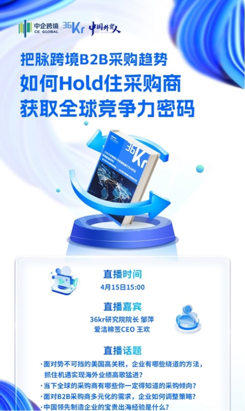 在全球贸易数字化浪潮下,跨境B2B行业正迎来前所未有的机遇与挑战。为助力中国企业抢占海外市场先机,中企跨境携手36氪研究院将在近期联合发布《2025年跨境B2B采购买家行为分析及采购渠道研究》白皮书,并于4月15日第137届广交会开幕之际,邀请36氪研究院院长邹萍、爱洁棉签CEO王欢等重磅嘉宾联手线上直播解读,敬请期待~