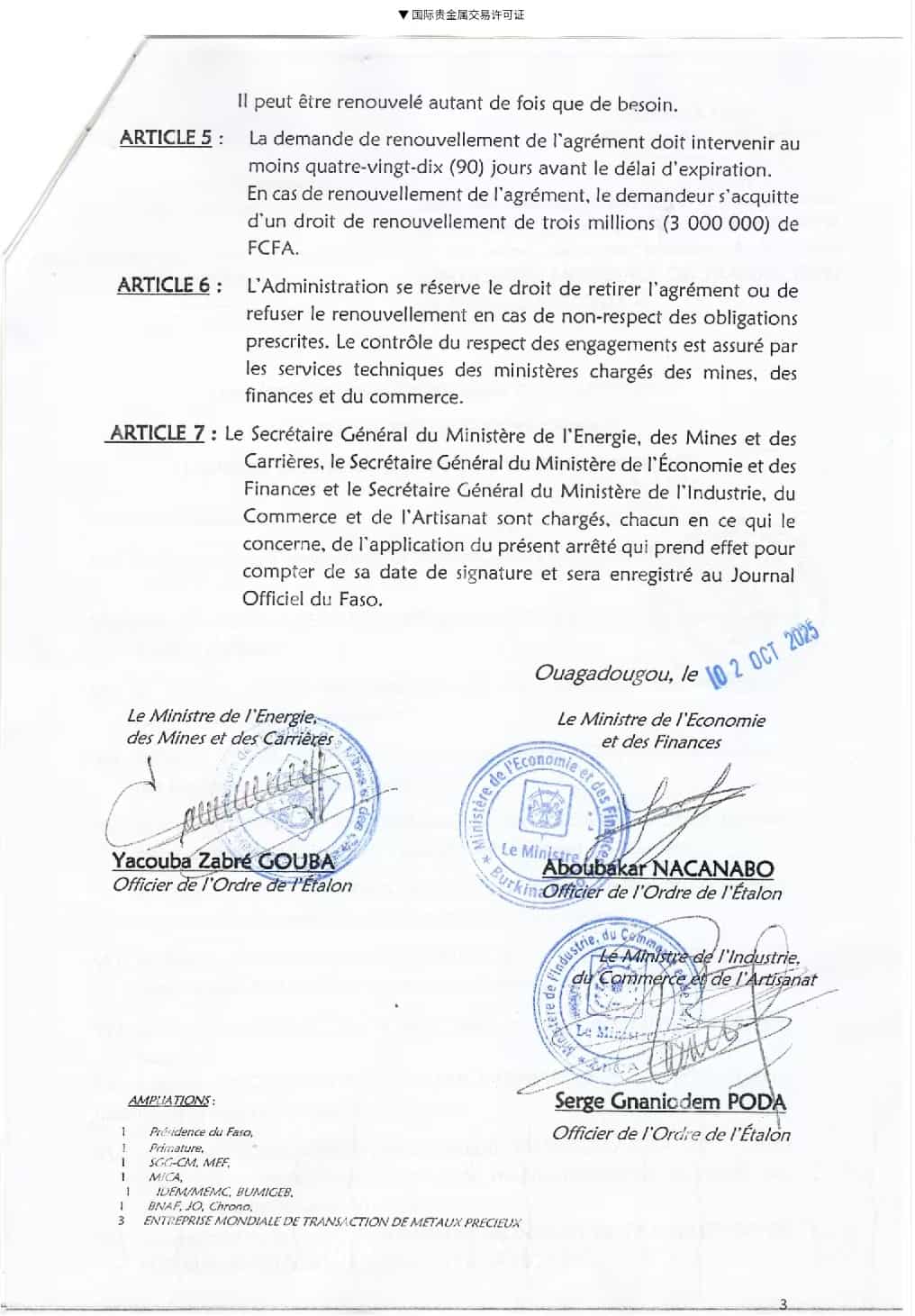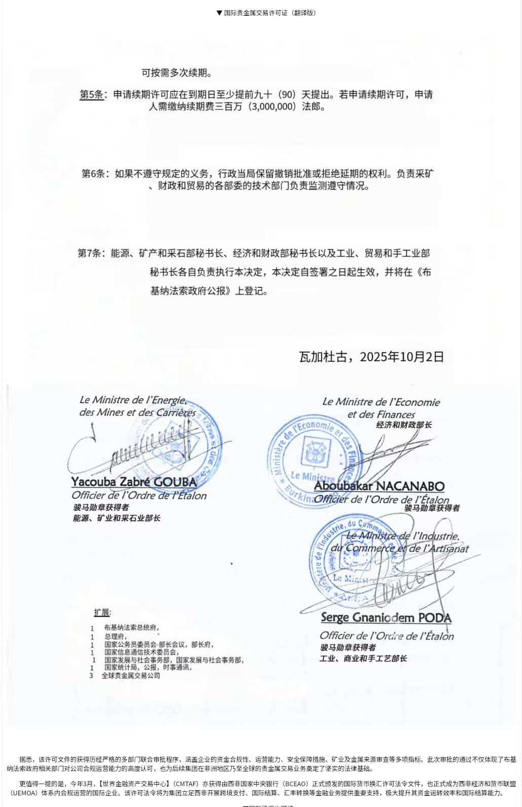2025年金秋十月伊始,运鸿集团迎来重磅消息。其在布基纳法索运营的【世界金融资产交易中心】(CMTAF)下设企业【世界金融贵金属交易公司】(EMTMP)正式获得由布基纳法索国家经济与财政部、国家能源矿业与采石业部、国家工业商业与手工艺部联合审批颁发的黄金及其他贵金属交易许可法令文件,标志着运鸿集团正式取得在该国及全球范围内合法开展黄金及其他贵金属交易的资质,其全球化战略布局迈出坚实一步。