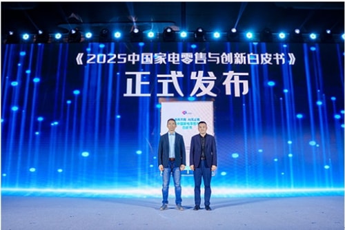中国家电网总编吕盛华(左)与奥维云网总裁郭梅德(右)共同发布《2025中国家电零售与创新白皮书》