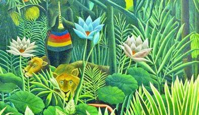 法国画家卢梭(Henri Julien Félix Rousseau)的画作同样具有代表性。在著名的《梦》中,他几乎不考虑所谓的虚实、疏密和透视关系,将人物、动物和植物以平面化的方式描绘和叠加在一起,稚拙而单纯。画面中,依偎在沙发上的少女周围,全是些奇异的植物和探头探脑张望的野兽。他有意将现实中的植物叶片放大比例,以一种看似并不符合透视关系的方式安排叶片的位置,与点缀其中的那些红色与蓝色的手掌形花朵交织在一起,“臆造”了一片热带阔叶林的景象,塑造出异样的梦境感。