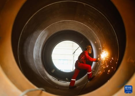 4月10日,在海油工程青岛建造场地,工人在建造现场进行钢材打磨作业。当日,渤海亿吨级油田——垦利10-2油田Ⅰ期海上作业平台开工建造。垦利10-2油田位于渤海南部海域,距离天津市约245公里,平均水深约15.7米,是2021年在莱州湾凹陷浅层发现的大型岩性油气藏,原油探明地质储量超过1亿吨。项目计划在天津、青岛两地三处场地新建1座中心平台、2座无人井口平台,铺设7条海底管道和4条海底电缆等。新华社发(杜鹏辉摄)