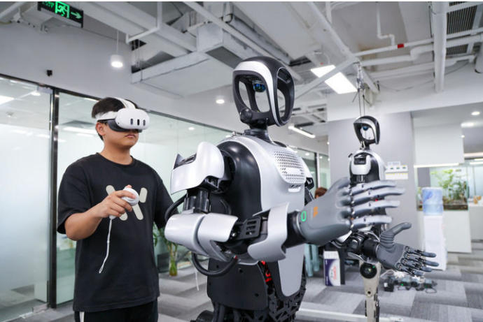 在深圳一家机器人企业,技术人员在调试人形机器人(2025年3月27日摄)。新华社记者 梁旭 摄