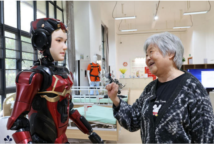 在深圳市养老护理院,一名老人与人形机器人互动(2025年3月3日摄)。新华社记者 梁旭 摄