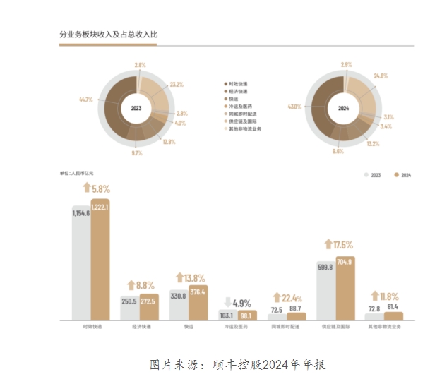 年报显示,顺丰控股的各业务板块在2024年得到了长足发展。得益于在大消费及工业制造业领域的渗透,顺丰的时效快递业务营收1222.1亿元,经济快递业务营收达到272.5亿元;快运业务营业收入达到376.4亿元,同比增长13.8%,货量规模同比增长超过20%;同城即时配送业务实现营业收入88.7亿元,同比增长22.4%;供应链及国际业务收入704.9亿元,同比增长17.5%,有效稳固了公司第二增长曲线。