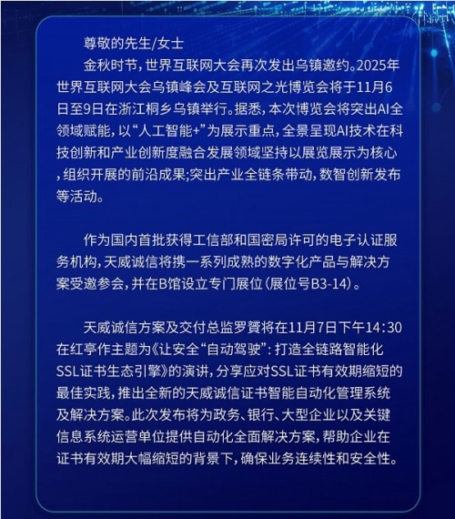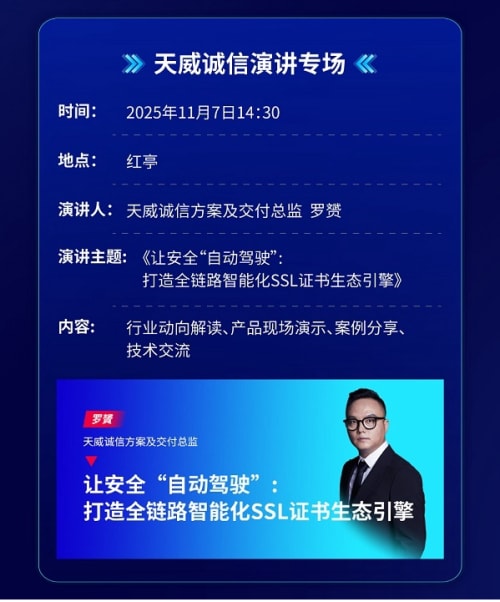 天威诚信方案及交付总监罗贇将在11月7日下午14:30在红亭作主题为《让安全“自动驾驶”: 打造全链路智能化SSL证书生态引擎》的演讲,分享应对SSL证书有效期缩短的最佳实践,推出全新的天威诚信证书智能自动化管理系统及解决方案。此次发布将为政务、银行、大型企业以及关键信息系统运营单位提供自动化全面解决方案,帮助企业在证书有效期大幅缩短的背景下,确保业务连续性和安全性。