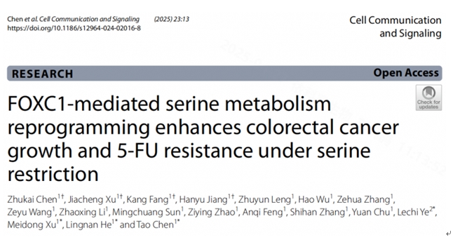 论文题目:FOXC1-mediated serine metabolism reprogramming enhances colorectal cancer growth and 5-FU resistance under serine restriction(FOXC1 介导的丝氨酸代谢重编程在丝氨酸缺乏条件下增强结直肠癌生长和 5-FU 耐药性)