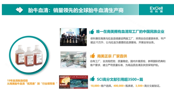 依科赛生物(ExCell Bio)创立于2013年,是中国生物制造上游领域领军企业之一,是全球前五、国内最大胎牛血清生产商之一,国内首选GMP级别细胞基因治疗无血清培养基品牌之一,也是抗体培养基定制化领导企业之一。2025年3月被福布斯和沙利文顶尖国际机构评为“中国行业发展领军企业”,致力于解决生物医药卡脖子、实现关键原料国产化,打造全球生物制药和生命科学研究细胞培养工具的领导企业。
