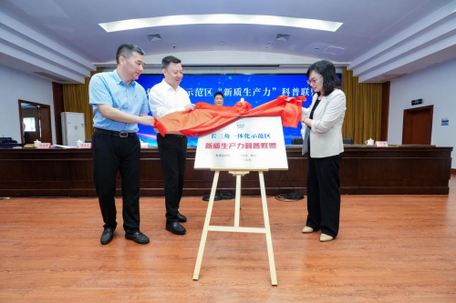 嘉善县科协、青浦区科协以及吴江区科协相关负责人,为长三角一体化示范区“新质生产力”科普联盟共同揭牌。