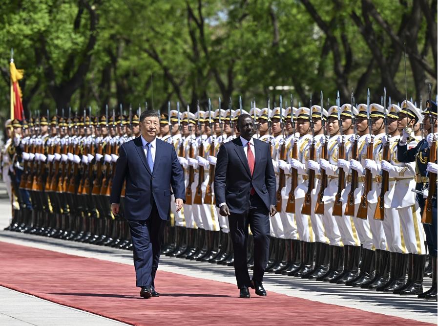 4月24日上午,国家主席习近平在北京人民大会堂同来华进行国事访问的肯尼亚总统鲁托举行会谈。这是会谈前,习近平在人民大会堂东门外广场为鲁托举行欢迎仪式。新华社记者 岳月伟 摄