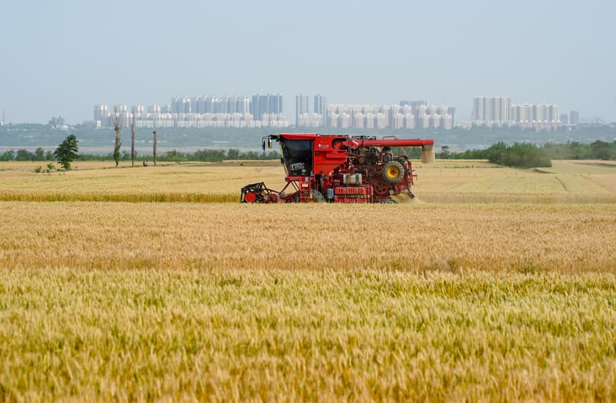 近日,山西省运城市432.77万亩小麦陆续进入成熟、收获期,当地抢抓天气晴好时机,全力做好农机调度,全面展开夏收工作,确保小麦颗粒归仓。闫鑫摄(人民图片网)