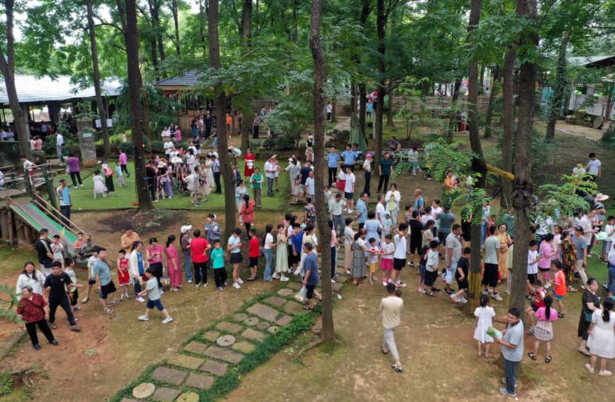 人民网樟树6月29日电 (记者时雨)28日,江西省樟树市观山镇举办了一场别开生面的“夏日乡村游园趴”,吸引了众多游客前来体验森林野趣,感受乡村振兴带来的生态魅力。 观山镇林场依托天然林地优势,精心策划了集露营、户外游戏、农事体验、乡土美食于一体的乡村游园活动。游客们可在清凉的林间搭建帐篷,参与彩绘、亲子树攀、趣味互动游戏等丰富多彩的项目,享受远离城市喧嚣的悠闲时光。