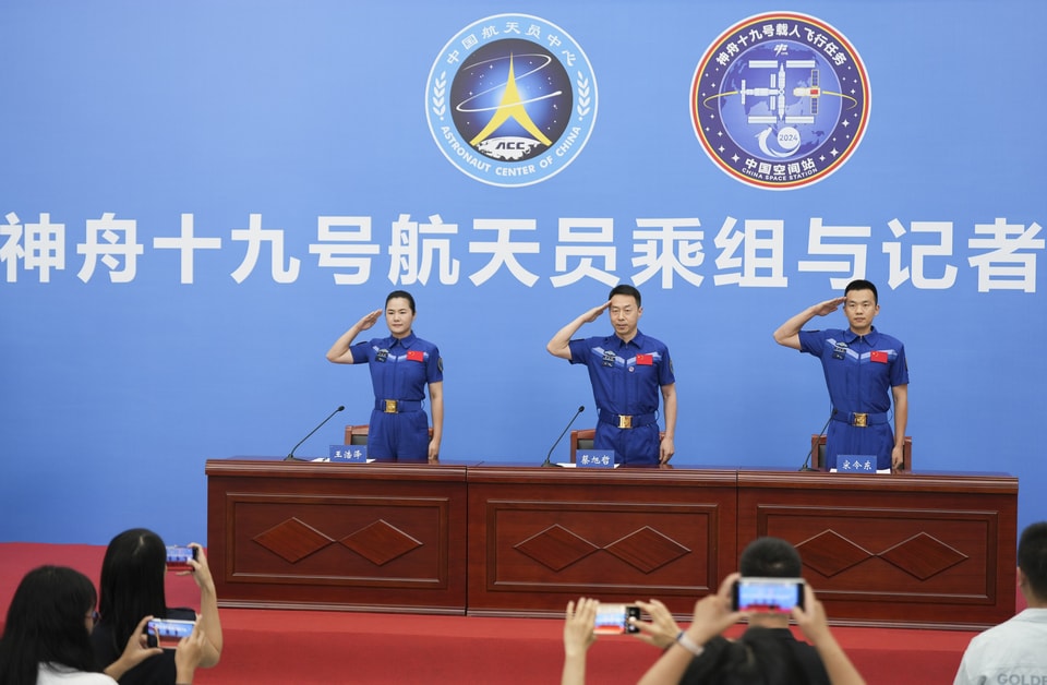 当日下午,中国航天员科研训练中心在北京航天城举行神舟十九号乘组与记者见面会,航天员蔡旭哲、宋令东、王浩泽太空归来后首次公开亮相,并分享183天“太空出差”的经历与感悟。