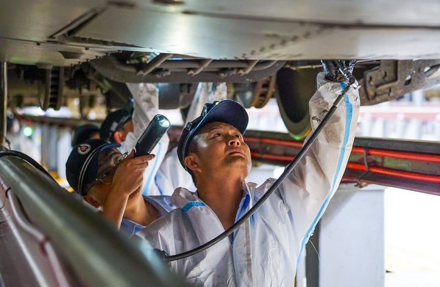 在作业现场,机械师们重点检查和测试动车组的空调、给排水卫生、供风及制动、车门等关键系统配件。为满足旅客乘车需求,加强对车内座椅、照明、电源等服务设施整修,确保配件齐全、功能正常;对卫生间进行细致整修,保证无漏水、不堵塞;对电茶炉功能进行检查试验,确保功能正常。