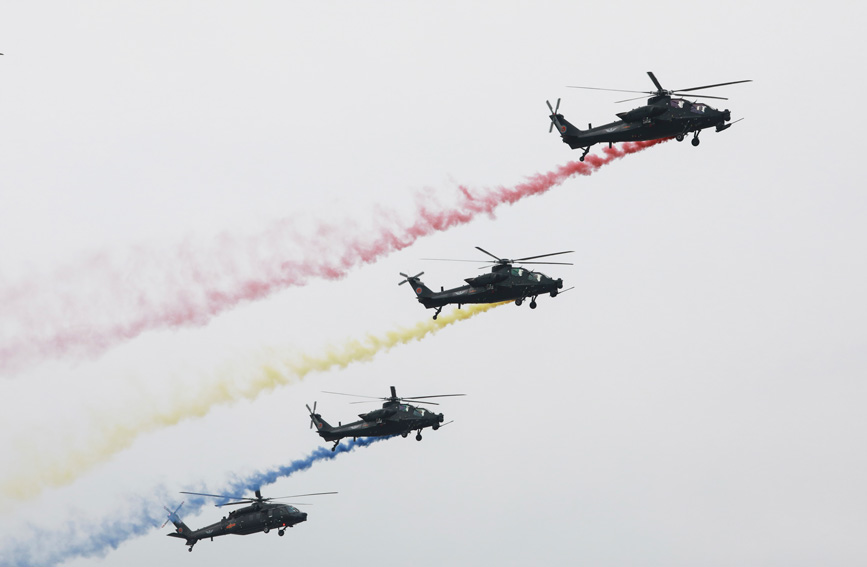 10月16日,在第七届中国天津国际直升机博览会开幕式上,陆军“风雷”飞行表演队进行飞行表演。