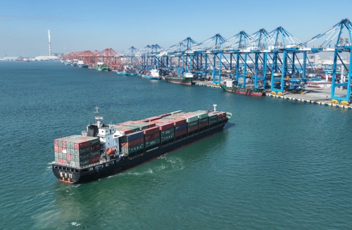11月29日,一艘海轮驶向钦州港码头(无人机照片)。