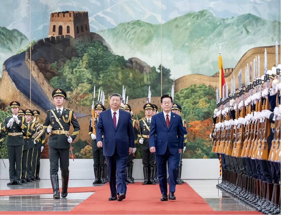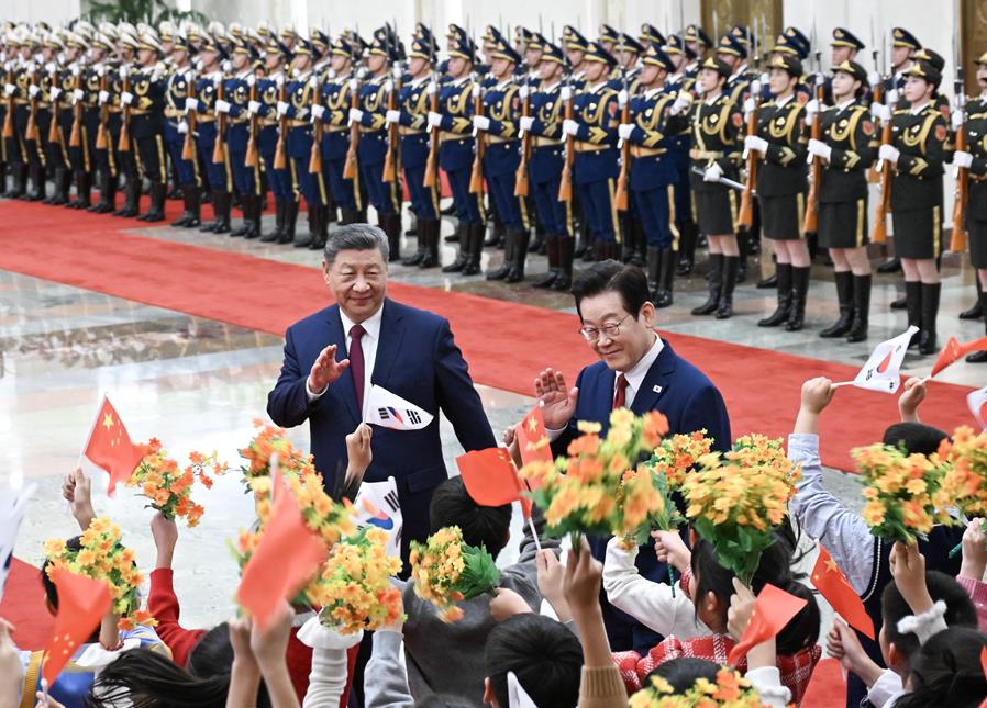 1月5日下午,国家主席习近平在北京人民大会堂同来华进行国事访问的韩国总统李在明举行会谈。这是会谈前,习近平在人民大会堂北大厅为李在明举行欢迎仪式。新华社记者 申宏 摄